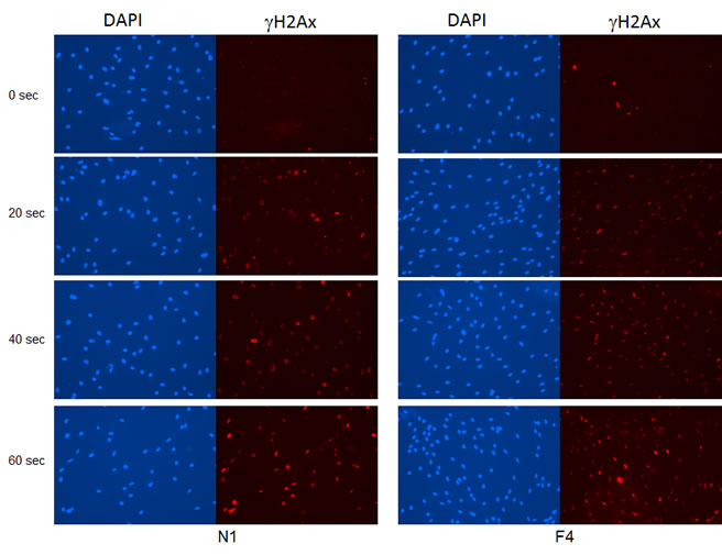 Figure 5: Induction of DNA damage by UV irradiation in SF cultures. SFs from a familial individual (F4) and a normal control individual (N1) were UV-irradiated for 20, 40 or 60 seconds, and then fixed in 3.7% formaldehyde at 2 hr after UV exposure. Double-stranded DNA breaks were visualized by γH2Ax immunofluorescence and nuclei were counterstained with DAPI.
