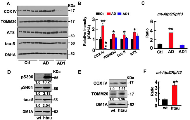 Figure 1: Tau-correlated mitophagy deficits were found in the brains of AD patients and the htau transgenic mice. A., B. Compared with the age-matched non-AD controls, the levels of mitochondrial marker proteins (COX IV and TOMM20), total tau proteins (tau-5) and phosphorylated tau (AT8) were increased in the homogenates of AD brains measured by Western blotting. DM1A against tubulin was used as a loading control. C. The increased ratio of mt-Atp6/Rpl13 (mitochondria-encoded DNA/nucleus-encoded DNA) measured by real-time PCR. D. The increased total tau (tau-5), and phosphorylated tau (pS396, pS404), and E. mitochondrial marker proteins (COX IV and TOMM20) in htau transgenic mice (htau) compared with the age-matched wild type littermates (wt) measured by Western blotting. F. The increased ratio of mt-Atp6/Rpl13 in htau mice measured by real-time PCR. Data were expressed as mean±SD. *, p < 0.05, **, p < 0.01 vs Ctl (the control) or wt (age-matched wild type littermates).