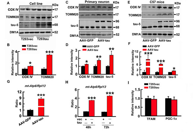 To verify the role of tau in mitophagy deficits, we overexpressed htau plasmid in HEK293 cells for 48 h (termed T293tau, Figure 2A, 2B), or the eGFP-labeled AAV2/8-htau in primary hippocampal neurons (7 div) for 48 h (Figure 2C, 2D), or in the hippocampal CA3 region of 3m-old c57 mice for 1 month by stereotaxic injection (Figure 2E, 2F), and the image of AAV2/8-eGFP transfected hippocampal CA3 region was shown as Supplementary Figure 1. Then, the levels of mitophagy markers together with tau proteins were measured by Western blotting. Compared with the vector transfected controls, the levels of COX IV, TOMM20 (Figure 2A-2F) and the ratio of mt-Atp6/Rpl13 (Figure 2G, 2H) were increased by overexpression of htau both in vitro and in vivo. We also found that the autophagy proteins Lc-3 II and p62 significantly increased (Supplementary Figure 2). Furthermore, a time-dependent increase of mt-Atp6/Rpl13 (~3.4-fold and 4.5-fold respectively at 48 h and 72 h) was detected in T293tau cells compared to the vector-transfected controls (T293vec) (Figure 2H). To confirm whether the increase of mitochondria is due to the mitophagy deficit or mitochondrial biogenesis, we detected mRNA levels of peroxisome proliferator-activated receptor γ coactivator 1α (PGC-1α) and mitochondrial transcription factor A (TFAM), two key transcription factors involved in the mitochondrial biogenesis [28, 29]. The results showed that overexpression of htau did not change the mRNA levels of PGC-1a and TFAM (Figure 2I). These are direct evidence showing that the htau accumulation blocks mitophagy.