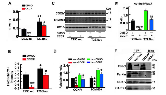 Figure 3: Tau increases mitochondrial membrane potential and induces mitofusin accumulation. A. T293tau or T293vec cells were treated with CCCP (20 μM) or DMSO (vehicle control) for 30 min, then the membrane potential (FL2/FL1) was measured by JC-1 staining (n = 10). B.T293tau or T293vec cells were incubated with TMRM (20 nM) for 30 min, and then the fold ΔTMRM+ intensity (ΔΨm) was analyzed. C.-E. Levels of mitochondrial marker proteins (COX IV and TOMM20) and ratio of mt-Atp6/Rpl13 were detected by Western blotting (C, D) and real-time PCR (E), respectively, in T293tau and T293vec cells after treatment with CCCP (20 μM for 30 min). (F) Levels of PINK1 and Parkin in cell lysates (Lys) and mitochondria (Mito) fractions measured by Western blotting. Data were expressed as mean±SD. *, p < 0.05; **, p < 0.01, ***, p < 0.001 vs T293vec+DMSO; #, p < 0.05, ##, p < 0.01 vs T293tau+DMSO.