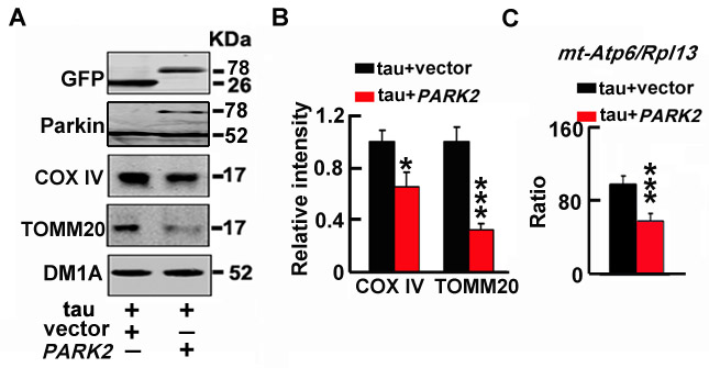 Figure 4: Up-regulating parkin rescues the htau-induced mitophagy deficits. A., B. T293tau cells were transfected with wild type parkin (PARK2) plasmid for 48 h, and then the mitochondrial marker proteins (COX IV and TOMM20) were measured by Western blotting. C. The ratio of mt-Atp6 and Rpl13 was assessed by real time PCR. Each experiment was repeated at least 3 times. The data are expressed as mean±SD. *, p < 0.05, ***, p < 0.001 vs vec.
