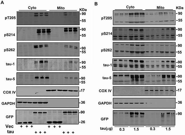 To identify the relationship of mitochondrial location of tau with its cytoplasmic accumulation in neural cells, we first transiently expressed htau in a selected Neuro 2a (N2a) cell line, which expresses negligible endogenous tau protein (Figure 6A). With the cytoplasmic tau accumulation, apparent tau signals were detected in the mitochondrial fraction (Figure 6A). To better mimic the AD-like intracellular tau accumulation, we transfected two different dosages of htau plasmid into another N2a cell line that expresses endogenous tau proteins [24]. Along with a dose-dependent cytosolic accumulation of tau, exogenous overexpression of htau increased the mitochondrial levels of total tau (tau-5), phosphorylated tau at pT205, pS214, and pS262, and the unphosphorylated tau at tau-1 epitope with major molecular mass of ~90 KDa and ~55 KDa (Figure 6B). These data confirm that intracellular tau accumulation can be dose-dependently allocated into the mitochondria.