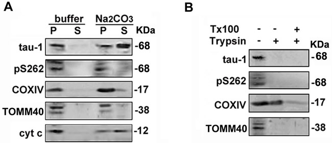 Figure 7: Tau may span on the mitochondrial outer membrane with some domains exposing to the inter-membrane spaces. A. The mitochondrial fractions prepared from T293tau cells were re-suspended in buffers with or without Na2CO3 (0.1 mol/L, pH 11.5) followed by centrifugation, and the supernatants (S) or membrane pellets (P) were detected with the indicated antibodies by Western blotting. B. Mitochondrial fractions were digested with trypsin in the absence or presence of 1% Triton X-100 (Tx-100) for 30 min or with mock control, and the protein level of tau was analyzed. TOMM40, COXIV and cyt c are respectively markers of mitochondrial outer membrane, inner membrane and intermembrane space proteins.