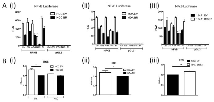 Figure 2: A. NFκB Luciferase Activity Assay of i) HCC EV and BR, (ii) MDA EV and BR and (iii) 184A1 EV and SH2 cells pre-treated for one hour with vehicle control (Ctrl), 250nM Gamma Secretase Inhibitor (GSI), 3.3μM ATM inhibitor (ATMi), 10 μM NAC or 10μM Parp inhibitor (Pi). Cells were then transfected with either NFkB reporter construct (NFκB) or the empty vector control (pGL3) with the relevant treatment. Renilla was used to normalise for transfection efficiency. Values are expressed as relative luciferase units (RLU) normalised to pGL3 and Renilla. B. Flow cytometry based analysis of Reactive Oxygen Species (ROS) using Carboxy-H2DCFDA in (i) HCC EV and BR cells treated with or without 10μM N-acetyl-L-cysteine (NAC), (ii) MDA EV and BR and (iii) 184A1 EV and SH2 cells.