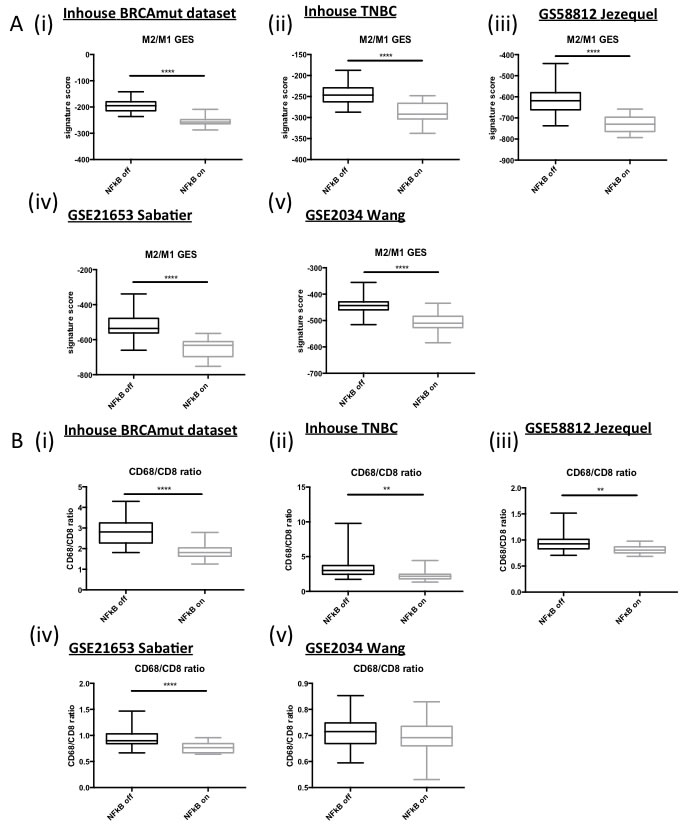 Figure 4: A. Box and Whisker plots of microarray derived M2/M1 Gene Expression Signature scores in (i) in house BRCA1 mutant dataset, (ii) in house TNBC dataset and publically available (iii) GSE58812, (iv) GSE21653 and (v) GSE2034 datasets. B. Box and Whisker plots of microarray derived CD68/CD8 expression ratios in (i) in house BRCA1 mutant dataset, (ii) in house TNBC dataset and publically available (iii) GSE58812, (iv) GSE21653 and (v) GSE2034 datasets.