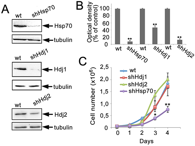 Figure 1: The reduction in expression of Hsp70, Hdj1 and Hdj2 chaperones in C6 rat glioma cells. The C6 cells were infected with lentivirus-encoded shRNA directed against sequences in HSPA1A (Hsp70), DNAJB1 (Hdj1) and DNAJA1 (Hdj2) chaperones. A. Representative Western blot for C6 cell lines: C6-wt, C6-shHsp70, C6-shHdj1 and C6-shHdj2. The lysates of cells of the lines indicated were subjected to polyacrylamide gel electrophoresis and the membranes obtained after blotting were stained with the appropriate antibodies. B. The intensity of bands in A was estimated with the use of Image J Software. Data of two independent experiments were calculated. C. Growth rates of C6-wt, C6-shHsp70, C6-shHdj1 and C6-shHdj2 cell sub-lines. Statistical significance is indicated as *P < 0.05 and **P < 0.001.