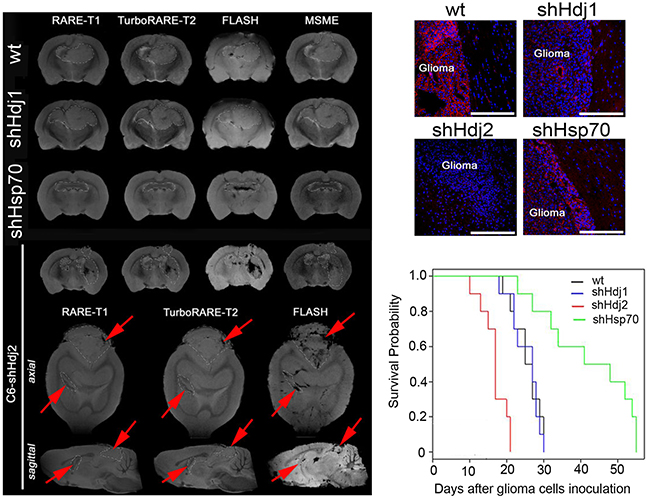 Figure 2: Knockdown of Hsp70 in C6 cells delays tumor growth and down-regulation of Hdj2 increases tumor aggressiveness and distant tumor lesion formation in vivo. A. Magnetic resonance brain imaging of C6-wt, C6-shHsp70, C6-shHdj1 and C6-shHdj2 glioblastoma-bearing animals on the 20-th day following tumor cell inoculation. On the additional axial and saggital MR scans for the C6-shHdj2 tumor, the leptomeningeal metastases are marked by red arrows. The MR images were obtained using FLASH, RARE-T1, TurboRARE-T2 and MSME regimes. B. Histological images of the tumor sections of C6-wt, C6-shHsp70, C6-shHdj1 and C6-shHdj2 glioma-bearing animals. F-actin was stained with rhodamine-phalloidin (red), and nuclei with DAPI (blue). Scale bar, 300 μM. C. Cumulative proportional survival of animals inoculated with C6-wt, C6-shHsp70, C6-shHdj1 and C6-shHdj2 cells, Kaplan-Meier graphs (N = 10 per group).