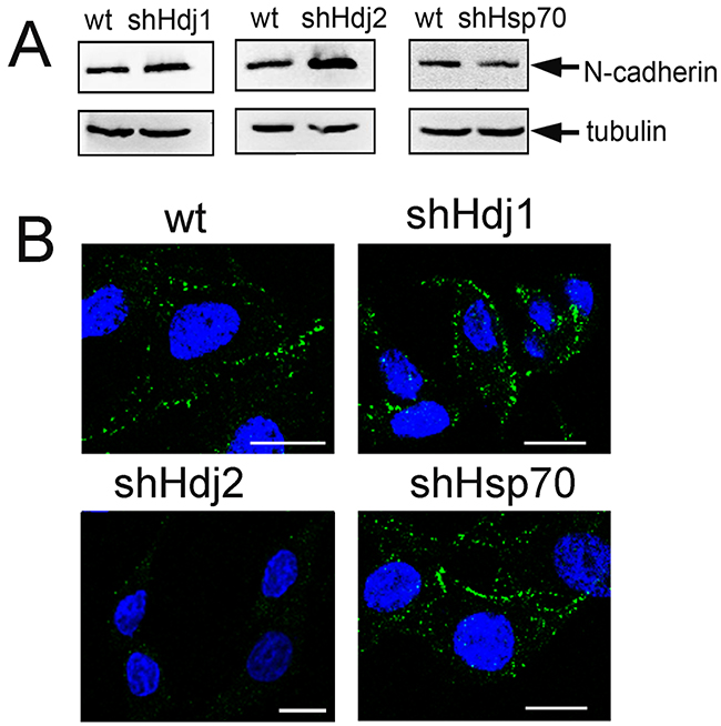 Figure 4: Knock-down of Hdj2 in C6 glioblastoma cells leads to the enhancement of N-cadherin intracellular amount and to its redistribution. A. Analysis of N-cadherin in C6-wt, C6-shHsp70, C6-shHdj1 and C6-shHdj2 cells via Western blotting. An anti-tubulin antibody was used as a loading control. B. Confocal microscopy of C6-wt, C6-shHsp70, C6-shHdj1 and C6-shHdj2 cells with the surface staining of N-cadherin (green). Nuclei were stained with DAPI (blue). Scale bar = 5 μm.