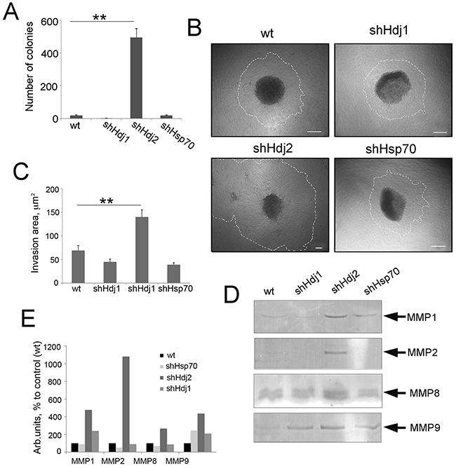 Figure 5: The knock-down of Hdj2 expression in C6 glioblastoma cells causes an increased ability for invasion as demonstrated by cell growth in Matrigel and metalloproteinase expression. A. Cells of C6-wt, C6-shHsp70, C6-shHdj1 and C6-shHdj2 were seeded into Boyden chambers with a membrane with pores of 8 μm. Twenty h later, cells on the plate bottoms were fixed and stained and the number of the colonies was calculated. Data of three independent experiments are presented. B. Spheroids of C6-wt, C6-shHsp70, C6-shHdj1 and C6-shHdj2 lines were placed into Matrigel, incubated overnight and photographed. Scale bar 100 μm. C. The invasion area was estimated as a residual between the total spheroid area with cells growing around (traced area) and the area of spheroid body itself determined using Image J Software. C. Activity of MMPs-1, -2, -8 and -9 in the culture medium of C6wt, C6-shHsp70, C6-shHdj1 and C6-shHdj2 cells as measured with the use of zymography. D. Quantitative analysis of MMP activity was performed using Image J software.