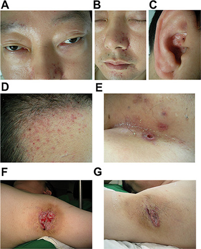 A 34-year-old man complains of bilateral axillary ulcers with pain for half a year, and has chest congestion, weakness and polyuria for 3 years. In the past 3 years, the patient developed many weaknesses, including alopecia, sexual dysfunction, weight increment, chest congestion, mastauxy accompanied with pain, polydipsia and polyuria. One year ago, the patient got bilateral axillary ulcers which grew gradually. Besides, his head and face also appeared “red rash” together with pruritus. He was diagnosed as “multiple Boil”, “skin and soft tissue infections”, “skin ulcers investigation”, “hidradenitis”, “eczema”, “candidiasis”, “Hailey-Hailey disease (suspicious)”, “seborrheic dermatitis” and etc. by various hospitals. He was treated with anti-infection agents, debridement and topical drugs, including povidone-iodine, fusidic acid, mupirocin and oral medicines (cefaclor and azithromycin). After these treatments, symptoms had no significant improvement so the patient came to Department of Dermotology, Shenzhen Second People’s Hospital, (Shenzhen, China) for further examination on April 13, 2015. The usage of the patient’s information was approved by him and the hospital ethics committee. He was considered asymptomatic because of not having fever, weight lost or night sweats. His family history was unremarkable. Physical examination revealed that the patient was mentally normal, with an anemia outlook, a fatty figure, a moon face and exophthalmos (Figure 1A). Double lung breath sounds rough, and there were moderate rough moist rales. He had a bulging abdomen, and the liver was palpable 3 cm away from the right costal arch, with a medium texture and a sharp edge. Dermatologist examination revealed that light red or yellowish-white millet pimples were appeared on his scalp and face (area around the nose and forehead mainly). There were greasy yellow scales on the surface, and it showed hemorrhagic spots after been removed forcibly. In bilateral inguinal, there were nest-like ulcers, each of which is as large as soybean. The surface was dry and has some blood scabs on it but without secretion. We could see irregular ulcers with clear boundary in both axillary, about 5cm-long. The skin around the ulcers was red, swelling and tender, with white thin moss-like substance and granulation tissue. There was no obvious fester and specific smell (Figure 1B–1G).