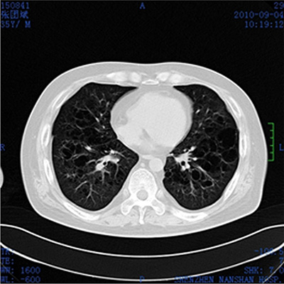 Figure 2: Brest CT plain scan. Higher penetrance of lung fields, extensive unequal-sized flake or cystic bright shade, and incrassate shade of interlobular septum.