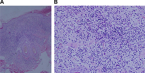 Figure 3: Lesion histopathological examination. (A) Dermal papilla edema, with abundant hyperplastic large round cells, in which we could see nuclear groove, together with several eosinophile granulocytes and lymphocytes infiltrated. (HE × 100). (B) Abundant hyperplastic large round cells, in which we could see nuclear groove, together with several infiltrated eosinophile granulocytes and lymphocytes. (HE × 200).