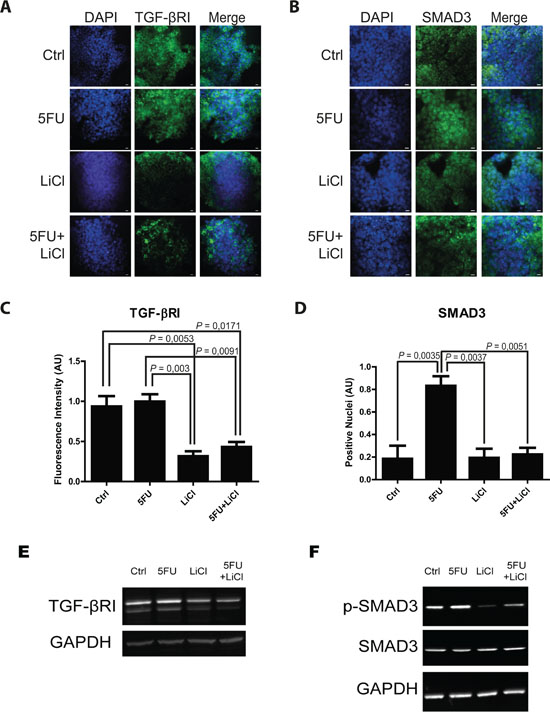Figure 2: 5-fluorouracil treatment causes an activation of TGF-β pathway in the in vitro 3D-cultured chemoresistant cells. Representative pictures of immunofluorescence analysis in 3D-cultured chemoresistant cancer cells. Cells were immunostained for TGF-βRI A. or SMAD3 B. (green) and with DAPI (blue). Bars represent 20 μm. C. Lithium administration caused a reduction of TGF-βRI expression as compared to control group in immunofluorescence analysis. D. 5FU treatment increased SMAD3 nuclear translocation, whereas Lithium co-treatment with 5FU was able to restore the basal condition. Significant P-values among groups after multiple comparisons are indicated above columns. Error bars represent SEM. E. Western blotting analysis of TGF-βRI in 3D-cultured chemoresistant cancer cells showing a similar trend as in in situ analysis. F. Western blotting analysis of p-Ser204-SMAD3 and SMAD3 in 3D-cultured chemoresistant cancer cells showing an increase of activating phosphorylation on Serine 204 of SMAD3 upon 5FU treatment. Images in E and F are representative of at least three independent experiments. GAPDH was used as equal loading control. p-SMAD3, phospho serine 204 SMAD3.