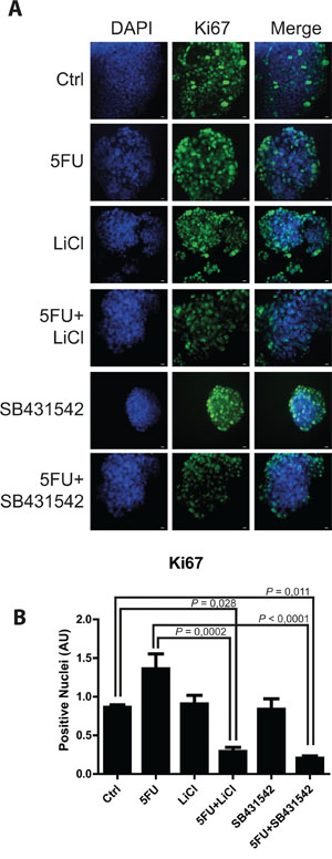 Figure 3: TGF-βRI inhibition reduced proliferation of 3D-cultured chemoresistant cancer cells. A. Representative pictures of immunofluorescence analysis for Ki67 (marker of cell proliferation, green) on 3D-cultured HCT116p53KO chemoresistant cell lines. Bars represent 20 μm. Nuclei were stained with DAPI (blue). B. Lithium or SB431542 treatments in combination with 5FU strongly downregulated Ki67 expression. Significant P-values among groups after multiple comparisons are indicated above columns. Error bars represent SEM.