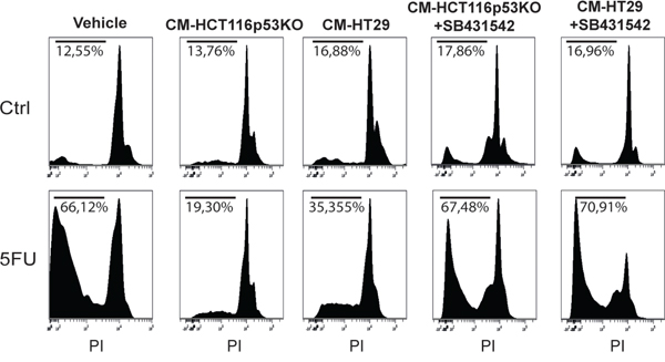 Figure 8: Conditioned medium from chemoresistant cells was able to protect chemosensitive HCT116 cells against 5FU toxicity. Propidium iodide incorporation assay analysis of conditioned medium (CM) experiments. CM from HCT116p53KO or HT-29 cells that received 5FU administration was able to induce chemoresistance in HCT116 cells (sub-G0/G1 cell populations indicated as percentage). When the inhibitor of TGF-βRI, SB431542, was added to 5FU treatment, the conditioned medium from chemoresistant cells completely lost its protective action. All images are representative of at least three independent experiments.