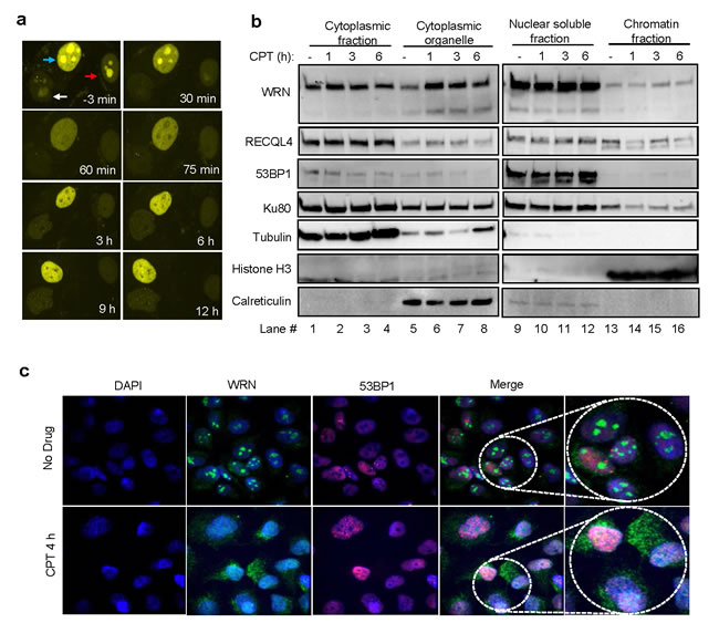 Figure 2: CPT-induced re-localization of WRN. a. Dynamic distribution of YFP-WRN in CPT-treated cells. Live cell time-lapse micrographs from CPT (10 µM) treated U2OS cells stably expressing YFP-WRN. Arrows point the nucleus of YFP-WRN expressing cells. b. WRN distribution in the subcellular compartments. Immunoblots indicating the relative levels of WRN in the cytoplasmic, cytoplasmic organelle, nuclear soluble and chromatin fractions of U2OS cells treated with and without CPT. Time indicate the length of the exposure to CPT. c. Enrichment of endogenous WRN in the cytoplasm. Confocal microphotographs showing WRN and 53BP1 localization in U2OS cells treated with CPT. Representative images from two independent experiments. Microscope images were taken with 40X objective.