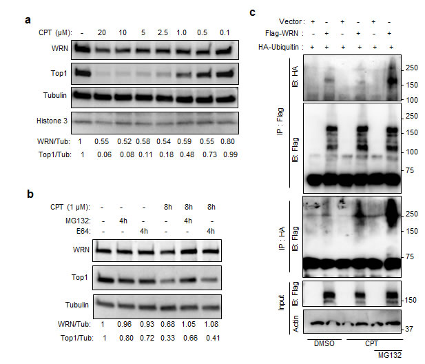 Figure 3: Ubiquitin proteasome-mediated degradation of WRN in CPT treated cells. a. CPT-induced WRN down regulation is associated with Top1 degradation. Immunoblots showing WRN and Top1 protein levels in U2OS cells treated with indicated concentration of CPT for 16 h. b. Proteasome inhibitor MG132 inhibits the effect of CPT on WRN and Top1. U2OS cells were treated with 10 µM MG132 to inhibit proteasome pathway and with 10 µM E64 to inhibit lysosome pathway. c. Ubiquitination of WRN in CPT treated cells. Immunoblots showing ubiquitinated (HA-ubiqutin) 3xFlag-WRN in immunoprecipitated fractions of CPT (1µM) treated 293T cells expressing 3xFlag-WRN and HA-ubiqutin.