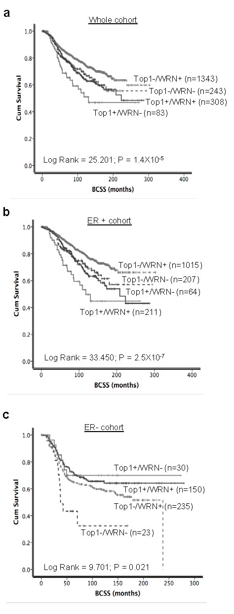 Figure 7: Kaplan Meier curves showing BCSS with WRN and Top1 expression. a. WRN and Top1 expression in whole cohort. b. and c. combined expression of WRN and Top1 in ER positive and ER negative METABRIC cohorts.