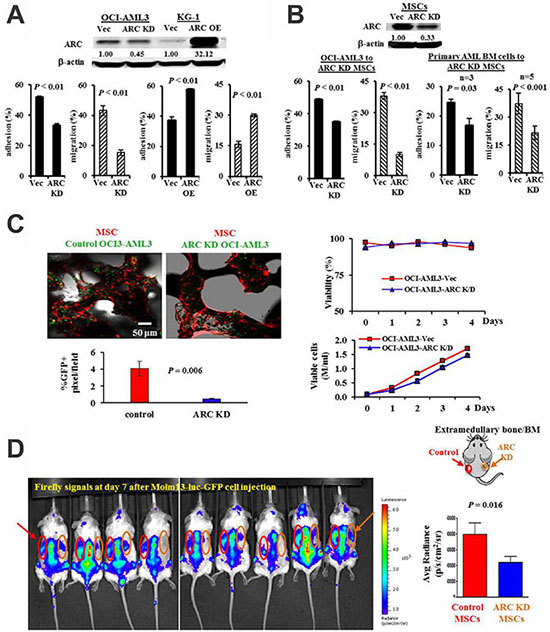 Figure 1: ARC regulates leukemia-stromal interactions. (A) Adhesion and migration of ARC KD OCI-AML3 and ARC OE KG-1 or their control cells to MSCs. (B) Adhesion and migration of OCI-AML3 and BM cells from AML patients to ARC KD or control MSCs. Adhesion was determined at 24 h and migration at 6 h for OCI-AML3 and 24 h for patient samples. (C) ARC KD or control OCI-AML3 cells (expressing GFP) were co-cultured with MSCs (expressing RFP) growing on the surface of bone chips. Attachment of leukemia cells to MSCs was measured at 24 h by confocal microscopy. A representative image and the quantifications from four images are shown on the left and viability and growth curves of ARC KD and control OCI-AML3 cells are shown on the right. (D) Molm13 cells (1 × 106) stably expressing a dual firefly luciferase–GFP reporter were injected into the tail vein of NSG mice harboring extramedullary bone/BM developed from either ARC KD or control human MSCs on each flank. Leukemia burden was monitored by IVIS imaging. Vec, vector control.