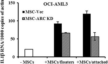 To assess if cytokine expression in leukemia cells was also regulated by MSCs, OCI-AML3 cells were co-cultured for 48 h with MSCs, sorted as shown in Figure 3A, and their IL1β expression was determined by real-time RT-PCR. We found that co-culture increased the expression of IL1β in AML cells. This effect was reduced, compared to the control MSCs, when the leukemic cells were co-cultured with ARC KD MSCs (Figure 5).