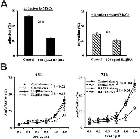 Figure 6: Inhibition of IL1β suppresses adhesion and chemotaxis of leukemia cells to MSCs and abolishes chemoprotection of MSCs to leukemia cells. (A) OCI-AML3 cells were added to MSCs which were set the night before and treated with ILβRA (100 ng/ml). Cell adhesion was determined after 24 h. OCI-AML3 cells were pre-treated with ILβRA (100 ng/ml) for 1 h and their migration towards MSCs was determined at 6 h. (B) OCI-AML3 cells, cultured alone or with MSCs were treated with Ara-C in the presence or absence of ILβRA (100 ng/ml). Apoptosis was assessed at 48 and 72 h by flow cytometry after staining cells with annexin V (AnnV) and 7-aminoactinomycin D (7AAD).