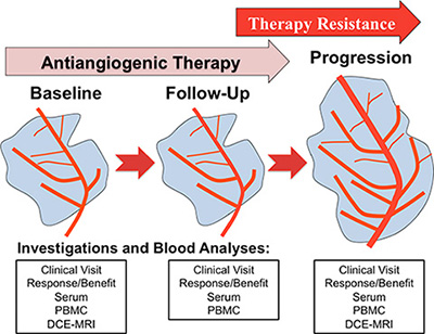 Angiogenesis, the formation of blood vessels, is a hallmark of cancer that significantly contributes to cancer progression and metastasis [1]. Increased tumor angiogenesis consequently limits prognosis and overall survival of cancer patients [1]. However, the success of blocking angiogenesis by inhibiting vascular endothelial growth factor (VEGF) is limited by insufficient efficacy and the development of resistance [2–5]. Preclinical studies suggest multiple markers and mechanisms potentially involved in intrinsic or acquired resistance against antiangiogenic therapies (reviewed in [5, 6]), but only few clinical studies evaluate surrogate markers during therapy.