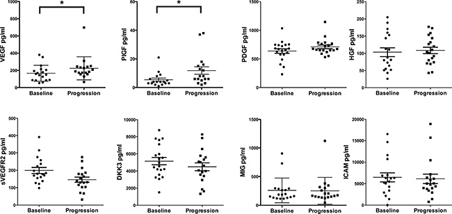 Figure 2: Cytokine analyses comparing baseline investigations with disease progression. Paired serum samples were analyzed from patients at baseline and disease progression. X-axis depicts the time points of measurements baseline versus disease progression. Y-axis depicts the measured cytokine in picograms per milliliter (pg/ml). *p ≤ 0.05. Abbreviations: vascular endothelial growth factor-A (VEGF), placental growth factor (PlGF), platelet derived growth factor (PDGF), hepatocyte growth factor (HGF), soluble vascular endothelial growth factor receptor2 (sVEGFR2), dickkopf3 (DKK3), monokine induced by gamma interferon (MIG), intracellular adhesion molecule1 (ICAM).