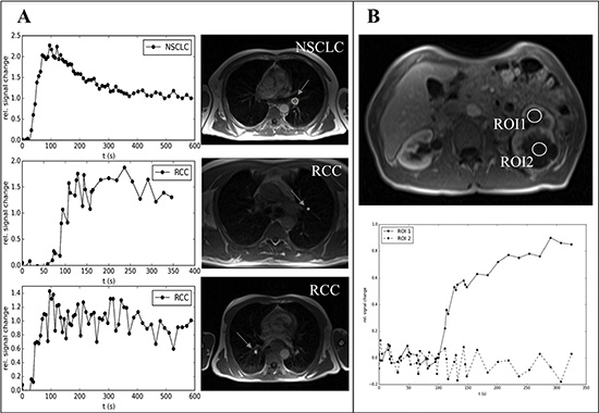 Figure 5: Representative examples of DCE-MRI of patients benefitting from antiangiogenic therapies (baseline assessment). (A) On the left side contrast media uptake curves and on the right side corresponding MRI images of the tumor at baseline are shown (the circle and arrows indicate the tumor). (B) Two regions of interest (ROI1 and 2) of an extensive primary RCC during antiangiogenic therapy are shown (upper picture). ROI1 shows contrast media uptake (type3 curve, normalization during sunitinib therapy) while ROI2 reflects necrosis in the tumor with almost no perfusion/permeability (lower picture). Abbreviations: dynamic contrast enhanced magnetic resonance imaging (DCE-MRI), renal cell cancer (RCC), non-small cell lung cancer (NSCLC), region of interest (ROI).