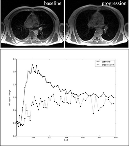 Figure 6: Representative example of DCE-MRI in a NSCLC patient during bevacizumab maintenance therapy at baseline and disease progression. In the upper row representative MRI images of the tumor at baseline and progression are shown (the circles indicate the tumor). Below the corresponding curves and changes in contrast media uptake behavior are depicted. The upper curve at baseline represents a type 3 curve, which correlates with an increased tumor microcirculation (permeability/perfusion) induced by the antiangiogenic agent (vessel normalization). At disease progression the contrast uptake curve was changed to a type 1 curve, which corresponds to lower permeability/perfusion. Abbreviations: dynamic contrast enhanced magnetic resonance imaging (DCE-MRI), non-small cell lung cancer (NSCLC), region of interest (ROI).