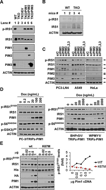 Figure 1: Expression of Pim1, 2, and 3 kinases control IRS1S1101 phosphorylation. (A) IRS1S1101 (IRS1S1097 in mouse) expression levels in WT, TKO, and TKO MEF cells expressing a single isoform of Pim kinase. (B) IRS1S1101 (IRS1S1097 in mouse) expression levels in kidney tissues of WT and TKO mice (two mice for each). Cell lysates of IRS1 expressing HEK293T transfectants were used as positive controls. (C) PC3-LN4, A549 and HeLa cells were transfected with siRNA targeting Pim1, 2, 3 or all three Pims and analyzed after 48 hr. (D) Prostate cancer PC-3 cells expressing tet-inducible Pim1, and human prostate fibroblast cell lines BHPrS1 and WPMY1 expressing tet-inducible Pim1 were stimulated with doxycycline at the indicated doses for 48 hr. Western blots were probed with the listed antibodies. (E) HA-tagged wild type (wt) and kinase dead mutant (K67M) Pim1 was co-transfected with his-tagged IRS1 in HEK293T cells. Densitometry of Western blot data was shown to measure the levels of Pim phospho-S1101 IRS1. These were normalized to total IRS1.