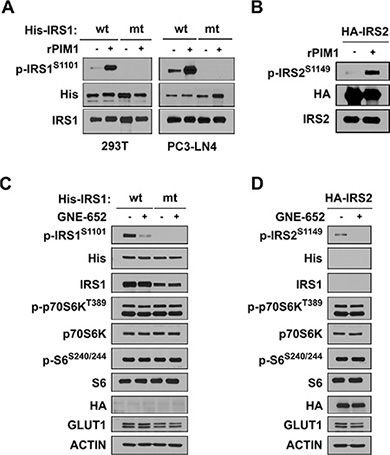 Figure 2: Pim kinase phosphorylates IRS1S1101 and IRS2S1149 proteins. (A) Wild type his-tagged IRS1 and its mutant S1101A were transfected into 293T (left) and PC3-LN4 (right) cells followed by immunoprecipitation with anti-His antibody. In vitro kinase activity was documented by Western blot analysis of S1101 phosphorylation of IRS1 in His-IRS1 immune complex with or without the addition of recombinant active Pim1 kinase (rPim1). (B) Extracts of HA-IRS2 transfected HEK293T cells were immunoprecipitated with anti-HA antibody and subjected to an in vitro kinase assay. Addition of recombinant active Pim1 kinase (rPim1) to HA-tagged immune complex induced IRS21S1149 phosphorylation. (C) LNCaP cells transfected with either wild type (wt) or S1101A mutant (mt) of His-IRS1 for 48 hr were treated with DMSO or the Pim inhibitor GNE-652 (0.2 μmol/L) for 30 min. Extracts were then Western blotted and probed with the antibodies listed. (D) LNCaP transfectants expressing HA-IRS2 were treated with DMSO or GNE-652 (0.2 μmol/L) for 30 min and Western blots carried out.