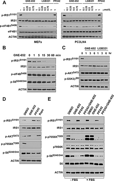 Figure 3: Pim kinase inhibitor blocks IRS1S1101 phosphorylation independent of mTOR activity. (A) MEF and PC3-LN4 cells were treated with GNE-652 or LGB321 in a dose dependent manner and PP242 (1 μmol/L) for 16 hr. (B, C) PC3LN4 cells were treated with GNE-652 (0.1 μmol/L) or LGB321 (0.1 μmol/L) for various times. (D) Calu-1 cells were treated with DMSO, GNE-652 (0.1 μmol/L), PP242 (2 μmol/L), or rapamycin (Rapa, 100 nM) for 1 hr. (E) PC3-LN4 cells were serum starved for an hour and then treated with GNE-6652 (0.1 μmol/L), PP242 (2 μmol/L), or GNE-652 plus PP242 for 1 hr. Alternatively, after starvation cells were re-stimulated with 10% FBS together in the presence of inhibitors.