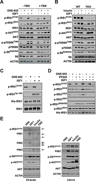 Figure 4: Inhibition of Pim kinases abrogates IRS1S1101 phosphorylation after insulin administration. (A) PC3-LN4 cells were stimulated with IGF1 (100 ng/mL) for 15 min. Prior to stimulation, cells were treated with DMSO or GNE-652 for 1 hr in the absence or presence of FBS. Extracts of the cells were made and Western blots carried out as shown. (B) WT and TKO MEF cells were serum starved for 1 hr and then stimulated with IGF1 (100 ng/mL) or insulin (400 ng/mL) for 15 min. Western blots were carried out with the labeled antibodies. (C) Western blot analysis of His-IRS1 immunoprecipitation samples. (D) Effects of GNE-652 on serine residues of IRS1. HEK293T transfectants expressing IRS1 were treated with either GNE-652 (100 nmol/L) or PP242 (2 μmol/L) for 1 hr and then exposed to IGF1 for 15 min. Cells were lysed and the resulting lysates were incubated with anti-His antibody and A/G agarose beads. Immunoprecipitated samples were subjected to Western blot analysis. (E) Effects of growth factors on Pim kinase protein expression. PC3-LN4 and C2C12 cells were serum-starved for 16 hr and then exposed to PBS, IGF1 (100 ng/mL), insulin (400 ng/mL) or 10% FBS for 6 hr. Lysed samples were subjected to Western blot analysis.