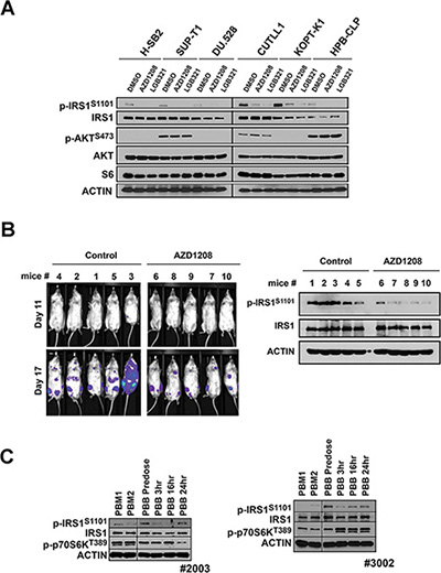 Figure 6: Phosphorylation of IRS1S1101 in response to administration of AZD1208, a Pim kinase inhibitor in tumor xenografts and AML patients. (A) Pim inhibitor AZD1208 reduces IRS1S1101 expression in leukemic cells. T-ALL cell lines H-SB2, SUP-T1, DU.528, CUTLL1, KOPT-K1 and HPB-CLP were treated with DMSO, AZD1208 or LGB321 for 24 hr and analyzed by Western blot. (B) The luciferase-expressing H-SB2 cells were injected via tail vein into sublethally irradiated NSG mice. Two days after the tumor injection, the mice were treated with AZD1208 (30 mg/kg twice a day by oral gavage) or vehicle control. Tumor growth was monitored by bioluminescence imaging at 11 and 17 days post cell injection. IRS1S1101 expression levels were examined by Western Blot analysis in lysates of bone marrow cells at necropsy. (C) Pim inhibitor AZD1208 reduces IRS1S1101 expression in samples from patients with AML. Analysis of IRS1 S1101 expression in bone marrow (PBM) and peripheral blood monolayer cell extracts (PBB) obtained from patients with AML who underwent AZD1208 therapy in Phase I clinical trial. PBM1 samples are collected at screening (pre dose bone marrow) and PBM2 are collected 2–6 hr after the first dose of AZD1208 (post dose bone marrow). Pre dose peripheral blood and post dose peripheral blood (3, 6, and 24 hr) were collected on day 1 (PBB1) and day 14 (PBB2).