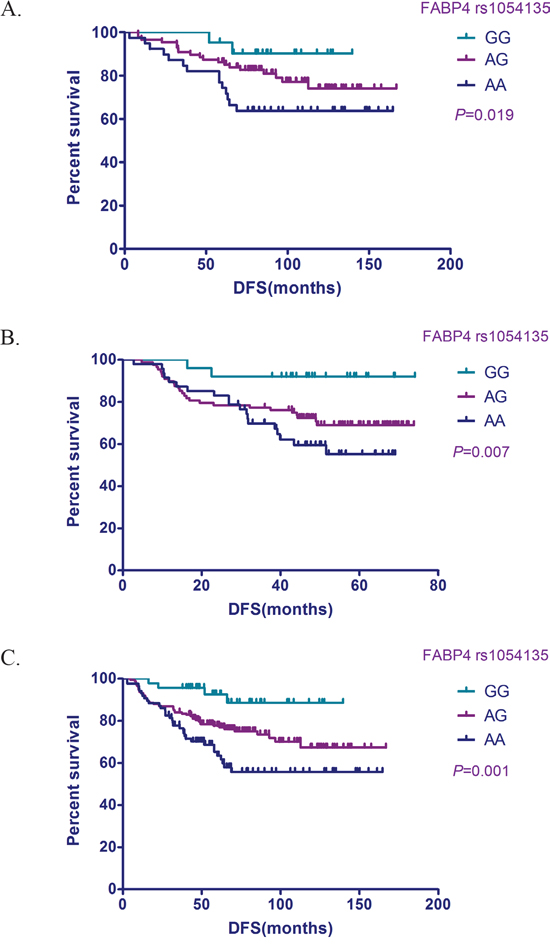 Figure 1: Relationship between the FABP4 SNP rs1054135 and DFS in TNBC patients. Kaplan–Meier survival probability plots stratified by FABP4rs1054135 genotype. A. Discovery cohort. B. Validation cohort. C. Combined sample.