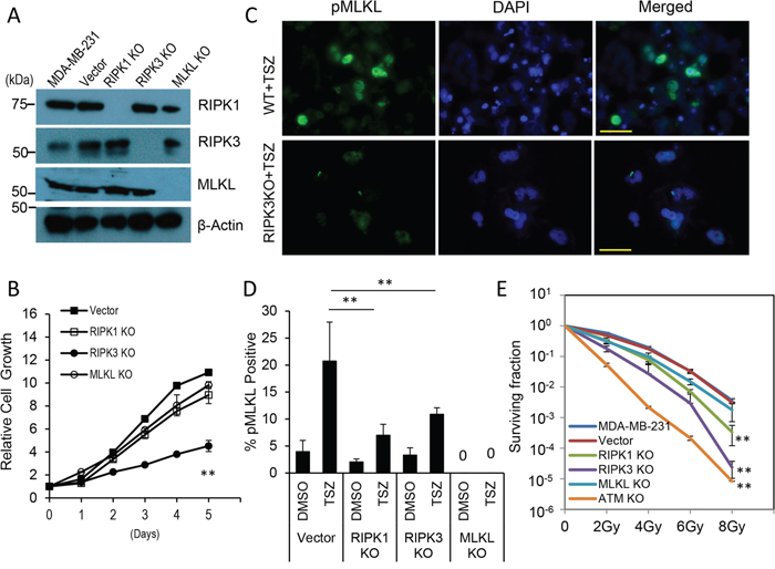 Figure 1: Effects of RIPK1-, RIPK3-, and MLKL- gene knockouts on MDA-MB-231 breast cancer cells in vitro. A. Western blot analysis of clonal MDA-MB-231 cells with CRISPR/Cas9-mediated knockouts of RIPK1, RIPK3, and MLKL genes, respectively. B. Growth curve of MDA-MB-231-derived RIPK1KO, RIPK3KO, and MLKLKO cells and lentiCRISPR vector transduced of MDA-MB-231 cells as measured by use of the MTT assay. The error bars represent standard error of the mean (SEM, n=3, **, p<0.001, Student’s t test). C. Immunofluorescence staining of phospho-MLKL (pMLKL) in TSZ (20 ng/ml TNFα, 100 nM Smac mimetic, 20 μM z-VAD-fmk) treated MDA-MB-231 vector control (top panels) and RIPK3 knockout (lower panels) cells. Scale bars represent 50 μm. D. Quantitative estimate of the percentage of pMLKL-positive cells in TSZ treated vector control-, RIPK1-, RIPK3- and MLKL- knockout MDA-MB-231cells. The error bars represent standard error of the mean (SEM, n=3, **, p<0.01, Student’s t-test). E. Survival curve of MDA-MB-231 derived vector control, RIPK1KO, RIPK3KO, and MLKLKO cells after x-Ray irradiation. Cas9/CRISPR derived ATM-knockout cells (ATM KO) were used as controls. Error bars represent standard error of the mean (SEM, n=3, **, p<0.001, Student’s t-test).