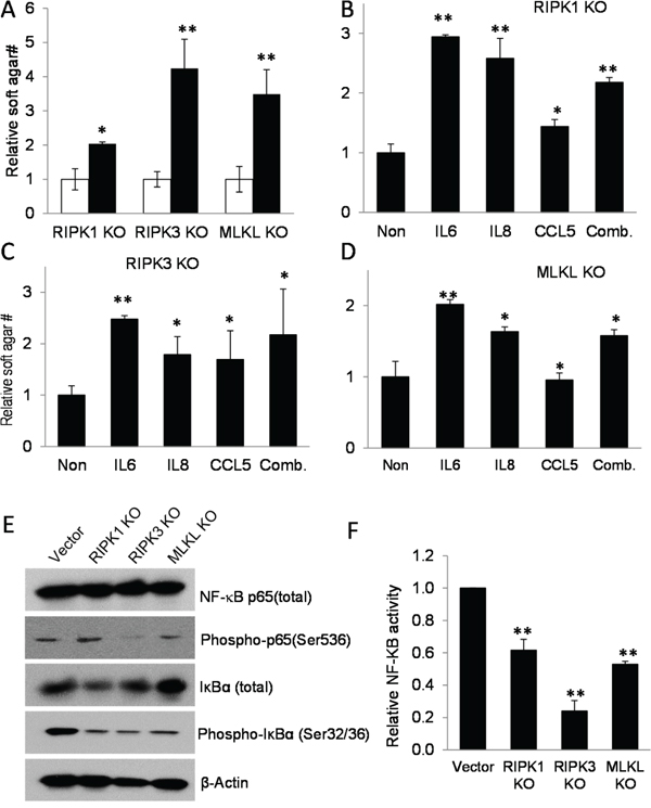 Figure 4: Cytokines regulated by necroptotic genes play key roles in sustaining tumor cell growth. A. Relative soft agar growth from MDA-MB-231 cell deficient in RIPK1, RIPK3, or MLKL cells without (□) or with (■) supernatant supplements from parental MDA-MB-231 cells at 40% of culture medium in soft agar plates. *, p<0.005, **, p<0.001, Student’s t-test. B. The effect of adding IL6 (20 ng/nl), IL8 (10 ng/ml), or CCL5 (5 ng/ml) individually or in combination(Comb.) on soft agar growth in RIPK1 knockout cells. *p<0.05, **, p<0.001, Student’s t-test. C. The effect of adding IL6 (20 ng/nl), IL8 (10 ng/ml), or CCL5 (5 ng/ml) individually or in combination(Comb.) on soft agar growth in RIPK3 knockout cells. *p<0.05, **, p<0.001, Student’s t-test. D. The effect of adding IL6 (20 ng/nl), IL8 (10 ng/ml), or CCL5 (5 ng/ml) individually or in combination(Comb.) on soft agar growth in MLKL knockout cells. *p<0.05, **, p<0.001, Student’s t-test. E. Western blot analysis of key NF-κB proteins p65 and IκBα. Vectors transduced MDA-MB-231 cells and those with the necroptotic gene knockouts were analyzed for total and phosphorylated p65 and IκBα status. F. Significantly attenuated NF-κB reporter activities in RIPK1-, RIPK3-, or MLKL- knockout MDA-MB-231 cells compared with vector-transfected MDA-MB-231 cells. NF-κB activities were assayed by use of a lentiviral vector encoding a reporter that consists of a NF-κB responsive promoter controlling a firefly luciferase gene. **, p<0.001, Student’s t-test. Error bars in C-E, and G represent SEM (n=3).