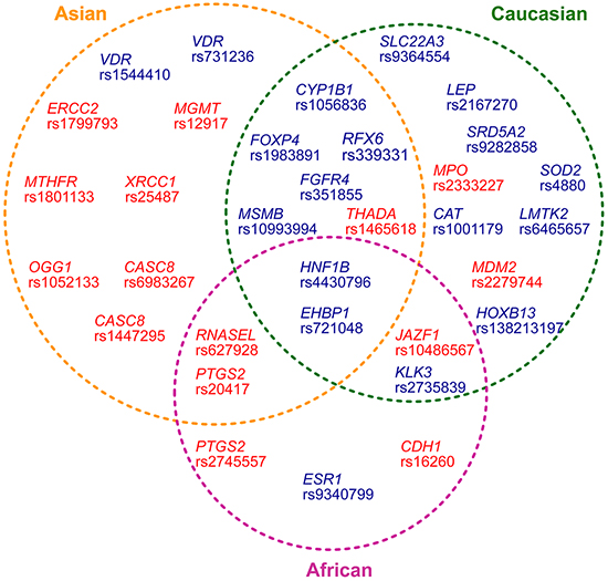 In summary, we have performed a comprehensive estimation of the genetic association between population-based gene-specific SNVs and PCa using currently available data. Our meta-analyses yielded twenty significant associations, but the bulk of their genetic effects were small or modest. Thus, the interpretation of these positive results should be cautious. Further analyses with sufficient power and investigations of the potential biological roles of these genetic variants are needed.