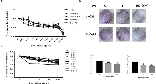 Figure 1: Everolimus suppressed cell proliferation and colony formation. The ovarian cancer cell lines, HEY, SKOV3, OVCAR5, IGROV1 and OV433, were cultured for 24 h and then treated with varying concentration of everolimus (from 10 to 25000 nM) in 96 well plates for 72 h. Cell proliferation was assessed by MTT assay (A). The effect of everolimus on long term growth in SKOV3 and OVCAR5 was assessed through a colony-forming assay (B). Ten primary cultures of human ovarian cancers were cultured for 24 h and treated with everolimus at 10 to 500 nM for 72 h. MTT showed that everolimus decreased cell proliferation in primary cultures of ovarian cancer (C). *p < 0.05, **p < 0.01.