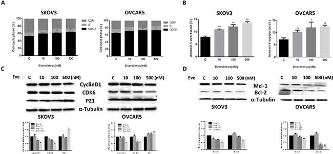 Figure 2: Everolimus induced cell cycle G1 arrest and cellular apoptosis. The SKOV3 and OVCAR5 cells were cultured for 24 h and then treated with everolimus at varying doses (from 10 to 500 nM) for 48 h. Cell cycle was examined by Cellometer. Everolimus induced cell cycle G1 arrest in a dose-dependent manner in both cell lines (A). The SKOV3 and OVCAR5 cells were treated with varying doses of everolimus for 24 h, and cell apoptosis was examined by an Annexin-V and PI double staining assay via Cellometer. Everolimus significantly increased cell apoptosis in a dose-dependent manner in both cells (B). The cells were treated with various concentrations of everolimus as indicated (from 10 to 500 nM) for 24 h, and the expression of cell cycle proteins were assessed using western blotting analysis. Everolimus decreased the levels of cyclin D1 and CDK6 and increased the expression of p21 in the SKOV3 and OVCAR5 cell lines (C). The protein expression of Mcl-1 and Bcl-2 was decreased after 24 h of treatment with the indicated doses of everolimus in the SKOV3 and OVCAR5 cells (D). *p < 0.05, **p < 0.01.