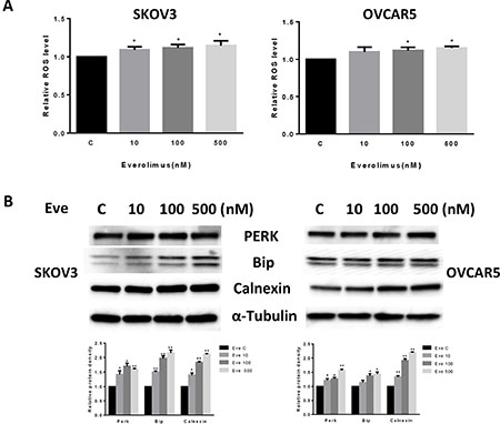 Figure 3: Everolimus induced cell oxidative stress in ovarian cancer cells. The SKOV3 and OVCAR5 cells were cultured for 24 h and treated with everolimus at 10 to 500 nM doses for 12 h. ROS production was tested using the DCFH-DA assay. Everolimus increased the ROS level in a dose-dependent manner in the SKOV3 and OVCAR5 cells after 12 h of treatment (A). The cells were treated with various concentrations of everolimus for 6 h. Western blotting showed that everolimus increased the expression of stress proteins (PERK, BIP and CALNEXIN) in the SKOV3 and OVCAR5 cell lines (B). *p < 0.05.