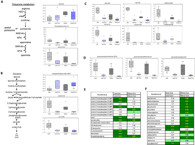 Figure 7: The effect of everolimus on small molecule composition involving metabolites in the KpB mouse model. Metabolomic profiling indicated that everolimus down-regulated arginine/putrescine/spermin metabolism in obese and lean KpB mice (A). Everolimus inhibited glycolytic activity in obese and lean KpB mice (B). The gut microbiome-associated metabolites and compounds were reduced in the lean and obese KpB mice after everolimus treatment (C). The glycerophosphocholine (GPC), glycerophosphoethanolamine (GPE), and glycerophosphoglycerol (GPG) were decreased in the obese and lean mice treated with everolimus (D). Dipeptide were significantly decreased in obese but not lean mice treated with evorolimus (E). The intermediates of pyrimidine metabolism were significantly decreased in the lean mice compared with obese mice after treatment with everolimus (F).