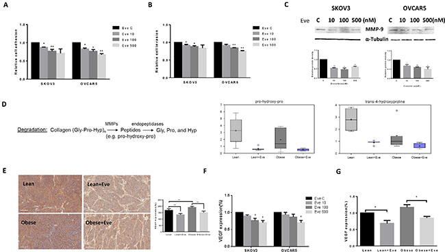 Figure 8: The effect of everolimus on adhesion and invasion in ovarian cancer cells and the obese serous ovarian cancer model. The SKOV3 and OVCAR5 cells were cultured for 24 h and then treated with everolimus (100 nM) in a laminin coated 96 well plate or BME coated 96 transwell plate for 24 h or 2 h to asses adhesion and invasion in a plate reader, respectively (A and B). Everolimus reduced cell adhesion and invasion in both cell lines. The MMP-9 protein was downregulated in the SKOV3 and OVCAR5 cell lines after treatment with everolimus for 24 h (C). In the KpB mouse model, metabolomic profiling showed that everolimus induced a degradation of collagen metabolites in obese and lean mice (D). Immunohistochemical analysis showed that the expression of VEGF protein was significantly decreased after everolimus treatment in lean and obese mouse (E). The level of VEGF after treatment in lean and obese mouse serum was measured by ELISA assays (F). SKOV3 and OVCAR5 cells were treated with everolimus at 10 to 500 nM for 24 h. The supernates from culture media were measured by ELISA assay. The results showed that everolimus decreased VEGF production in ovarian cancer cell lines (H). *p < 0.05, **p < 0.01.