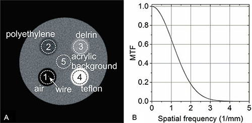 Figure 1: CBCT Image quality. (A) A transverse plane of the CBCT image of the Image quality phantom. There are five heterogeneities imbedded inside the acrylic cylinder. Regions of interest (ROIs) were placed on each heterogeneity for signal to noise ratio (SNR) and contrast to noise ratio (CNR) analysis: air, polyethylene, delrin, teflon, and acrylic background (from 1 to 5). The arrow points to the 50 μm radiopaque wire stretched through the air heterogeneity for spatial resolution measurement. (B) The modulation transfer function (MTF) derived from a wire based oversampling method.