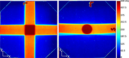 Figure 3: The dose distribution from 4 evenly separated beams. A total of 5 Gy dose was delivered to the center of a water equivalent cubic phantom of 63 × 63 × 63 mm3 size. (Left and right images) are the dose distribution in the x-y plane, and x-z plane, respectively. Dose distribution was obtained from EBT2 films inserted in the phantom.