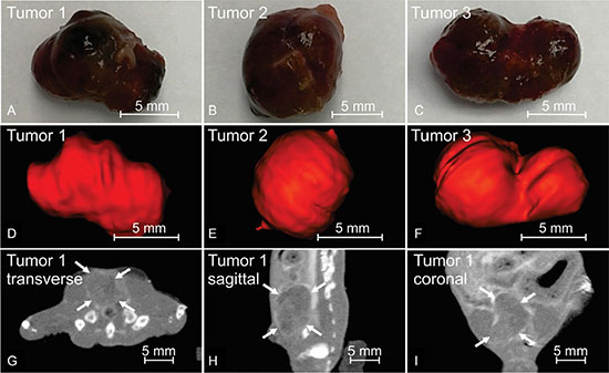 Figure 4: Contrast enhanced CBCT of orthotopically grown LNCaP prostate tumors. Panel (A–C) show the LNCaP prostate tumors excised immediately after the animal was euthanized, with dark red color indicating rich vasculature. (D–F) are the three-dimensional rendering of corresponding tumors contoured from CBCT scanned immediately before animal sacrifice. (G–I) are the three orthogonal CBCT slices of tumor 1, with arrows pointing to the enhanced tumor edges. Comparison between (a)-(c) and (d)-(f) proves a good match between the CBCT contours and actual tumor volumes.