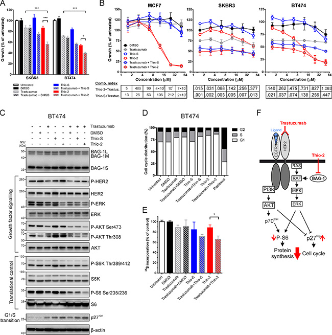 Figure 5: Synergistic effect of targeting BAG-1 and HER2 on breast cancer cell growth and signaling. (A) SKBR3 and BT474 cells were treated for 5 days with DMSO (0.125% v/v), trastuzumab (16 μg/ml), Thio-S (12.5 μM), Thio-2 (12.5 μM) or combinations of these compounds, as indicated. Cell growth was measured using crystal violet assay and is expressed as a percentage of untreated cells. Data shown on the graph are the mean ± SEM from 3 independent experiments, each with three technical replicates. Statistical significance was determined using two-way ANOVA with Holm-Sidak multiple comparisons test. *p < 0.05, ***p < 0.001. (B) MCF7, SKBR3 and BT474 cells were treated over 5 days with increasing concentrations of Thio-S, Thio-2, and/or trastuzumab at a constant ratio. Cell growth was measured by crystal violet assay and is expressed as a percentage mean ± SEM of untreated cells. Combination indexes were determined by CalcuSyn v2.11; values < 1 indicate synergism. (C) A representative immunoblot of 3 independent experiments shows the effect of single compounds and compound combinations (concentrations listed in Figure 5A), 24 h after treatment, on the phosphorylation and expression levels of molecules involved in growth factor signaling and translation/cell cycle control downstream of HER2 and BAG-1; β-actin was used as a loading control. (D) BT474 cells were treated with single compounds or compound combinations (concentrations listed in Figure 5A) for 48 h and were subsequently harvested and stained with propidium iodide for cell cycle analysis (20,000 events/sample) using ModFit LT v4.1.7. Bar graph shows the proportion of cells in each phase of the cell cycle as a percentage of the total number of cells stained. Paclitaxel (100 nM) treatment for 24 h was used as a positive control for cell cycle arrest. Data are representative of three independent experiments. (E) BT474 cells were metabolically labelled with 35S to quantify global protein synthesis following 24 h treatment with the compounds indicated (concentrations listed in Figure 5A). 35S incorporation corresponding to the total amount of protein synthesis is expressed as a percentage of diluent control. Data shown on graph are the mean ± SEM from 3 independent experiments, each with three technical replicates. Unpaired t-test was used for comparison between different treatments; *p < 0.05. (F) Simplified schematic diagram of PI3K/AKT and RAF/MEK/ERK signaling pathways downstream of HER2 and BAG-1. Red arrows indicate the molecular changes which occur as a result of combining trastuzumab with Thio-2, an inhibitor of BAG-1 protein-protein interactions.