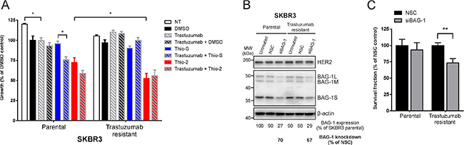 Figure 6: Trastuzumab-resistant SKBR3 cells are sensitive to BAG-1 inhibition. (A) SKBR3 parental or trastuzumab-resistant cells were treated over 5 days with DMSO (0.5% v/v), trastuzumab (32 μg/ml), Thio-S (50 μM), Thio-2 (50 μM), or combinations of these compounds as indicated. Cell viability was measured using crystal violet assay and is expressed as a percentage of DMSO control. Data shown on the graph are the mean ± SEM from 3 independent experiments, each with three technical replicates. Statistical significance was determined using two-way ANOVA with Holm-Sidak multiple comparisons test. *p < 0.05. (B) A representative immunoblot shows BAG-1 and HER2 expression levels in SKBR3 parental and trastuzumab resistant cells 4 days following siRNA (50 nM) knockdown. Densitometric analysis of immunoblots from 3 independent experiments was used to determine expression of total BAG-1 protein and is expressed as a percentage of untreated SKBR3 parental cells. The amount of BAG-1 protein knockdown by siBAG-1 is expressed as a percentage of the corresponding NSC treatment for each cell line; β-actin was used as a control for loading. (C) Bar graph shows the effect of BAG-1 knockdown by siRNA (50 nM) on the long-term growth potential of SKBR3 parental or trastuzumab-resistant cells. Data shown on graphs are the mean ± SEM from 3 independent experiments, each with 3 technical replicates. Unpaired t-test was used for comparison between different treatments; **p < 0.01.