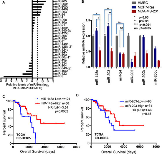 Figure 1: Low expression of miR-148a correlates with poor breast cancer patient prognosis. (A) Expression levels of 29 miRNAs were profiled in MDA-MB-231 cells and normalized to levels in HMEC cells. (B) Expression of 6 miRNAs was determined in HMEC, MCF7-Ras, and MDA-MB-231 cells. Error bars indicate Standard Errors (n = 3). (C) and (D) Kaplan-Meier curves for overall survival for high and low expression of miRNAs, miR-148a (C) and miR-203 (D), in ER-HER2- subtype of breast cancer. Data was extracted from TCGA. P values were calculated with Log-rank (Mantel-Cox) test. Hazard ratios were calculated using the method of Mantel-Haenszel.