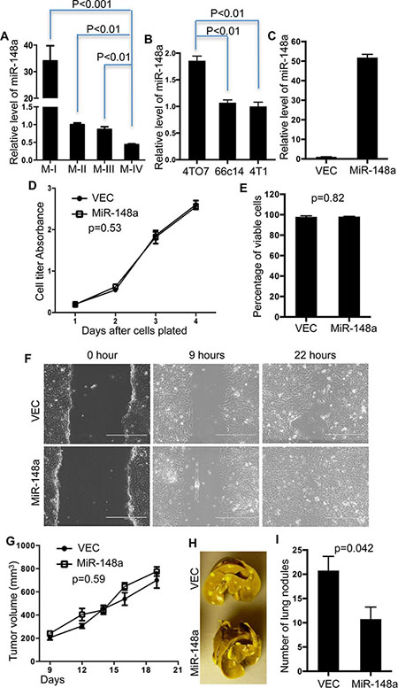 Figure 2: Overexpression of miR-148a suppresses 4T1 lung metastasis. (A) Expression levels of miR-148a were determined in M-I, M-II, M-III, and M-IV cells and normalized to the expression level in M-II. Error Bars indicate Standard Errors (n = 3). (B) Expression levels of miR-148a were determined in 4TO7, 66c14, and 4T1 cells and normalized to the expression level in 4T1. Error Bars indicate Standard Errors (n = 3). (C) Expression levels of miR-148a were determined in 4T1 cells with overexpression of miR-148a (MiR-148a) normalized to control cells (VEC). Error Bars indicate Standard Errors (n = 3). (D–F) 4T1 cells with overexpression of miR-148a (miR-148a) and control cells (VEC) were examined for growth (D), viability (E), and migration/invasion (F). Error Bars indicate Standard Errors (n = 3). P values were calculated with two-way ANOVA (D) or unpaired, two-tailed t test (E). (G) Tumor sizes were measured and calculated at the indicated time points. P value was calculated with two-way ANOVA. Error Bars indicate Standard Errors (n = 5). (H) Representative pictures of lungs with metastatic nodules developed from 4T1-VEC or 4T1-miR-148a cells. (I) Lung nodules were quantified. Error Bars indicate Standard Errors (n = 5). P value was calculated with unpaired, two-tailed t test.
